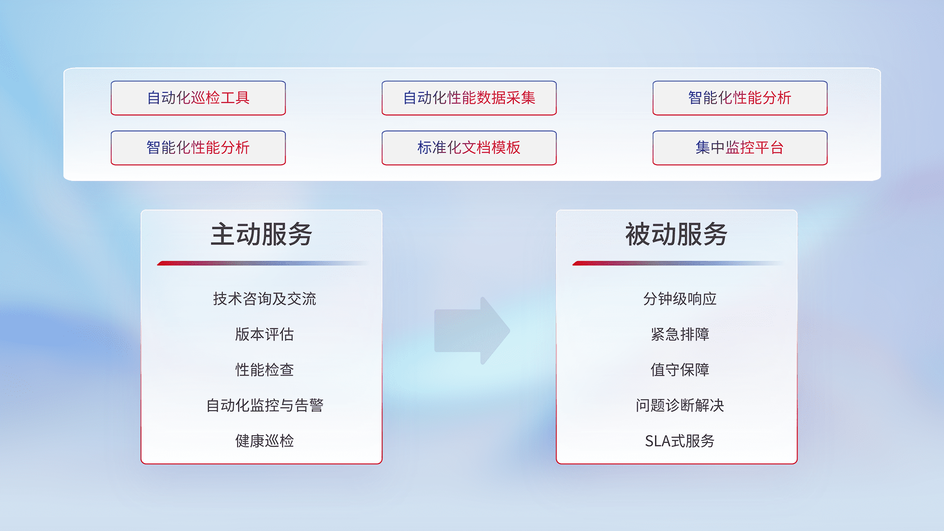 智能化工具和标准化文档,,保障服务质量,,,,提供主动服务(包含技术咨询、、、、版本评估、、、性能检查、、、自动化监控与告警、、、、健康巡检)和被动服务包含(分钟级响应、、紧急排障、、值守保障、、、问题诊断解决、、、、SLA服务)。。。